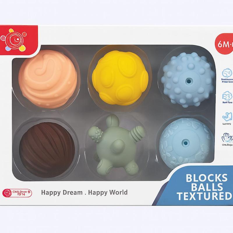 - توپ های حسی رنگارنگ در ۶ طرح برجسته مختلف و با جنس سیلیکون در یک پک جمع آوری شده و مناسب استفاده از بدو تولد تا خردسالی